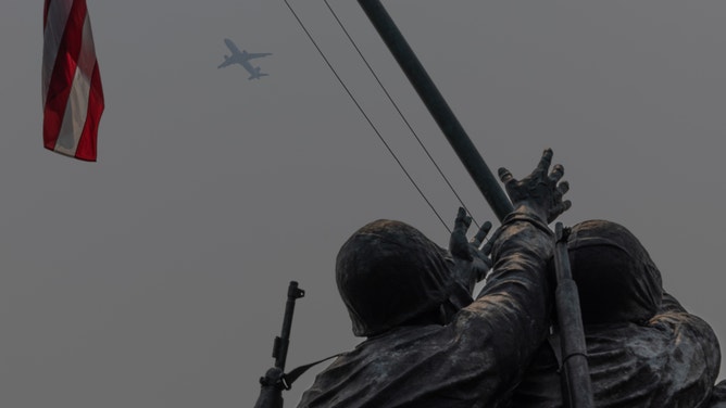 ARLINGTON - JUNE 7: A commercial airplane takes off over the Iwo Jima Marine Corps Memorial in Arlington, Va., on Wednesday, June 7, 2023. Heavy smoke from Canadian wildfires were visible throughout the region Wednesday. (Photo by Tom Brenner for The Washington Post via Getty Images)