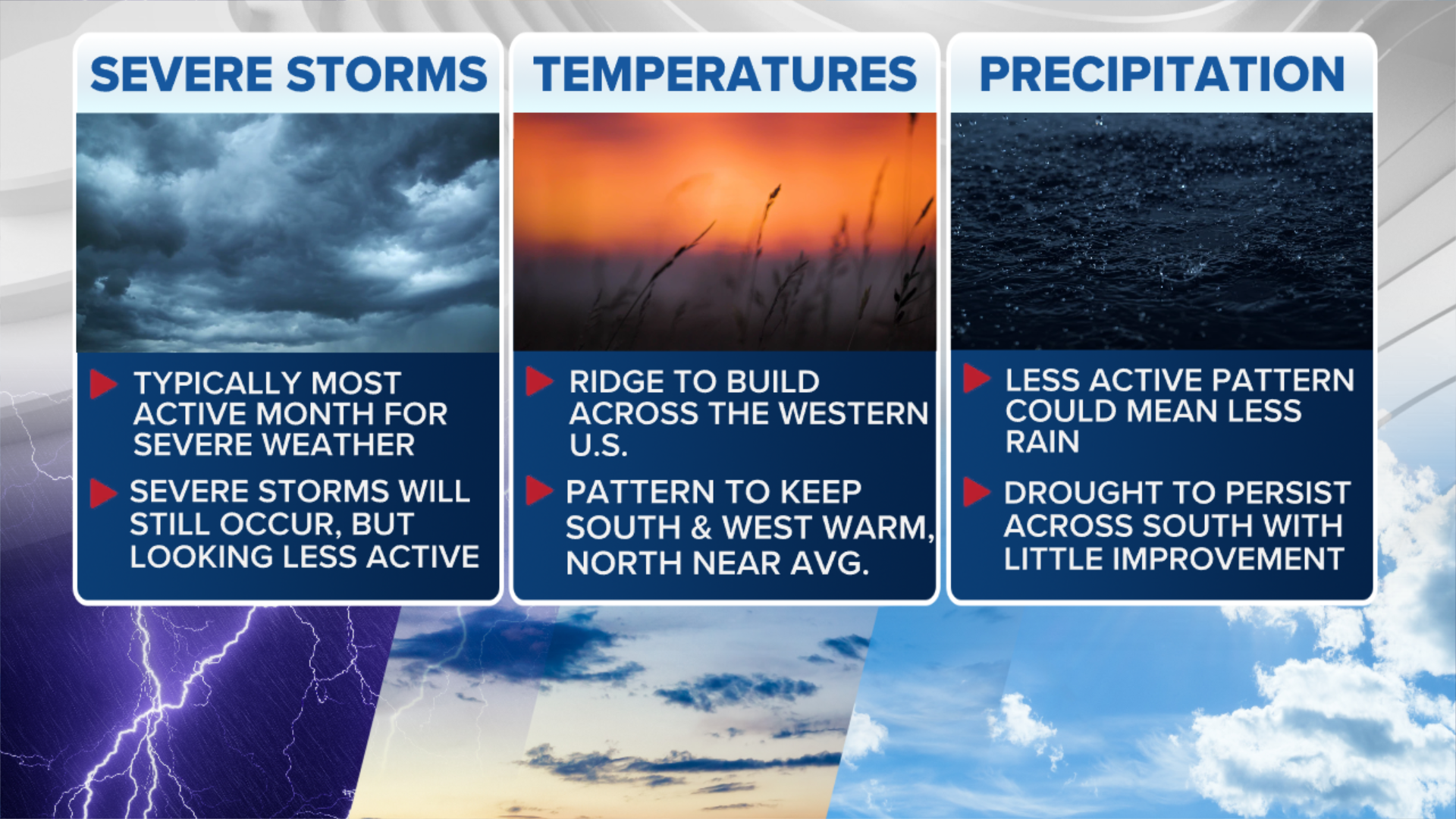 Although severe storms are still likely during May, the prolonged stretches of extreme weather may not be as significant as in recent weeks.