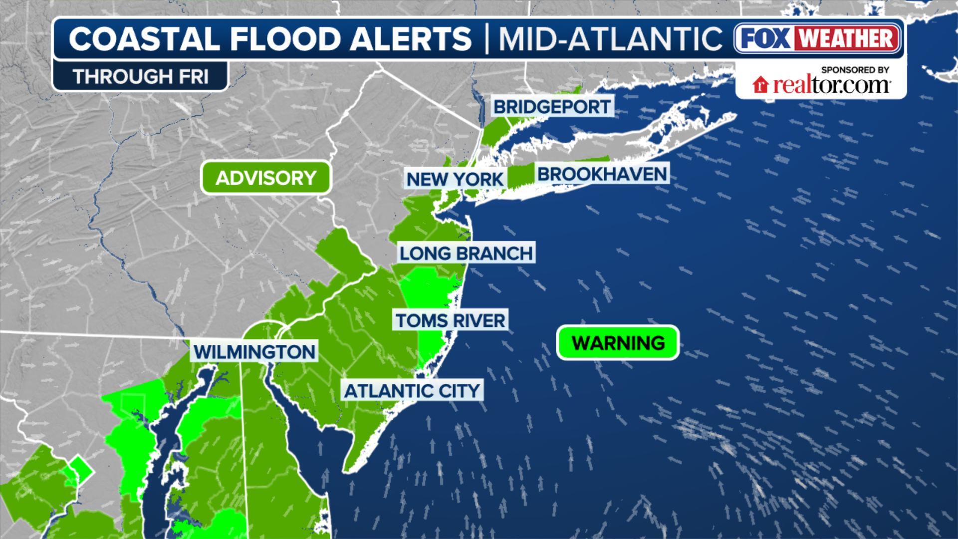 A Coastal Flood Warning also remains along North Carolina's Outer Banks and up through other portions of the Mid-Atlantic through Friday where beach erosion remains a risk. Coastal flood advisories stretch north through New Jersey.