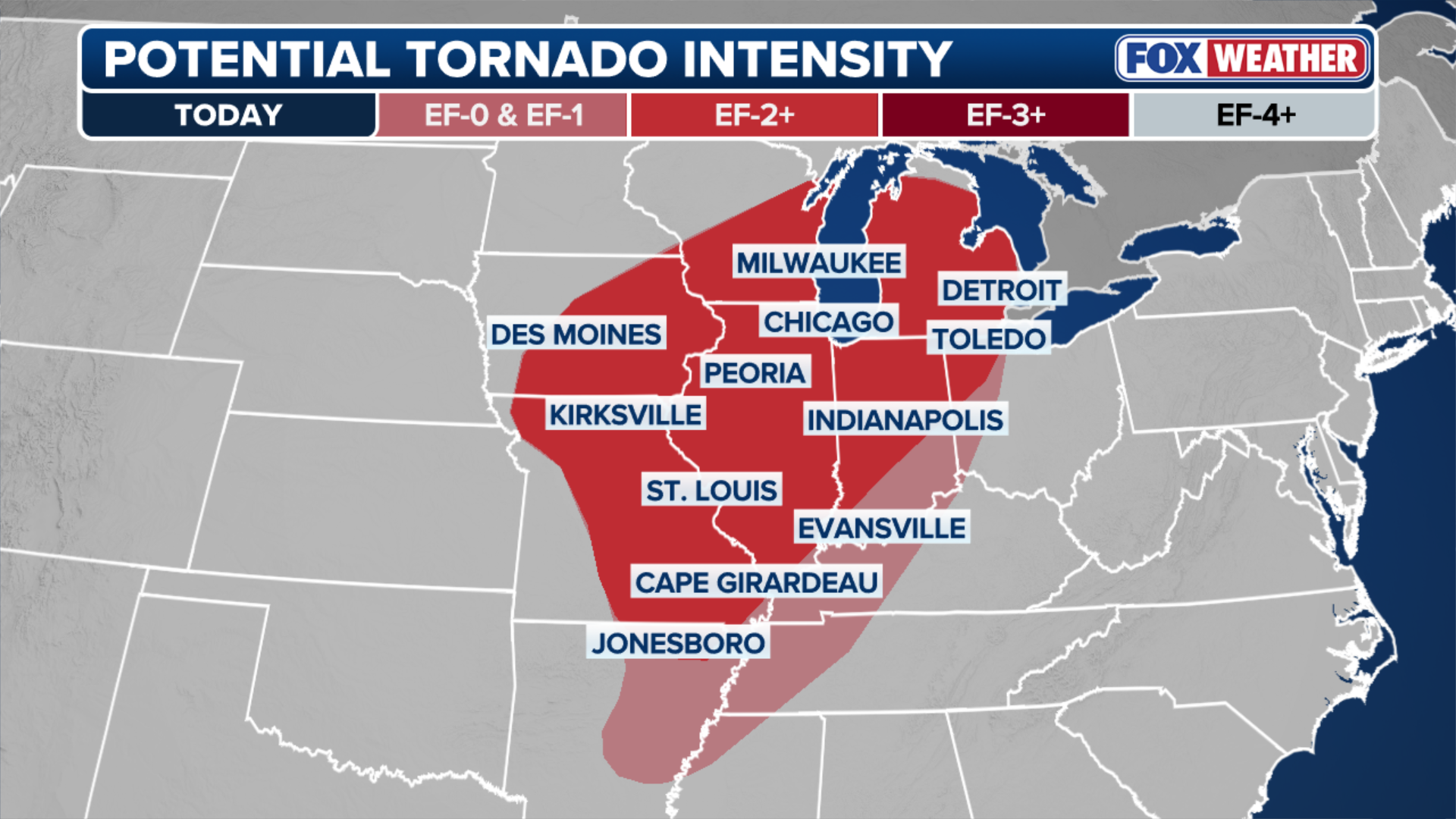 The risk of strong (EF-2+) tornadoes spans a corridor more than 700 miles long, from Missouri to Michigan.