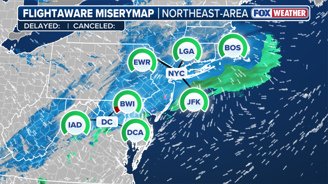 A Winter Storm Warning is in place in Philadelphia, and Winter Weather Advisories are scattered throughout the region, including in New York City, Baltimore and Washington, D.C.