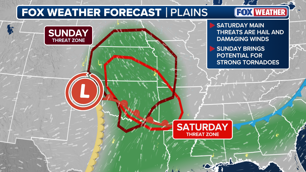 SEVERE WEEKEND: FOX Weather Meteorologist Steve Bender breaks down the looming severe storm threat for the Southern portions of the U.S., as damaging hail, winds, and the potential for tornadoes are possible. Stay tuned to FOX Weather all weekend as we track these developing storms.