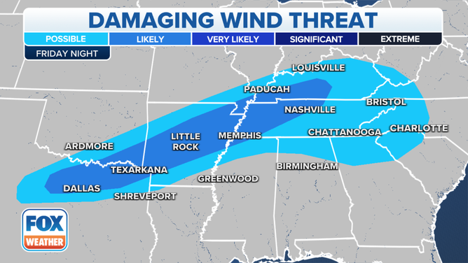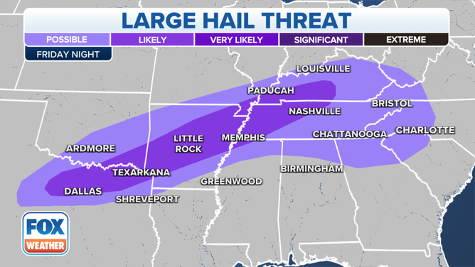 The severe storm threat will materialize late Friday into the overnight hours from North Texas to the Tennessee Valley. This includes the cities of Dallas/Fort Worth, Nashville and Memphis, Tennessee. The storms will be capable of all severe weather hazards, including large hail, damaging wind gusts and a few tornadoes.