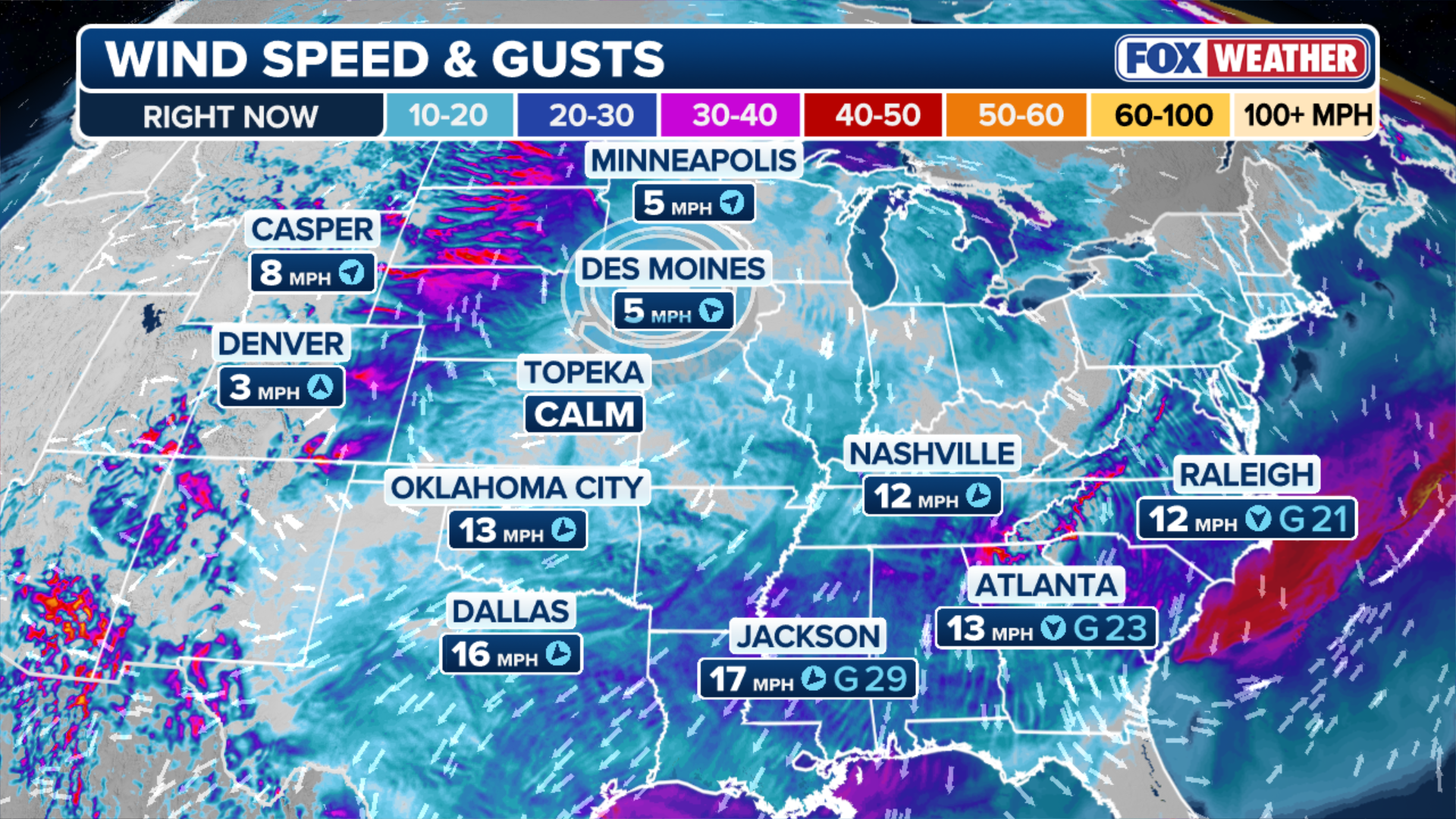 In the Southeast, humidity will drop as low as 20%, especially across parts of South Carolina, southern Georgia and north Florida. Sustained winds will reach 10-20 mph with higher gusts.