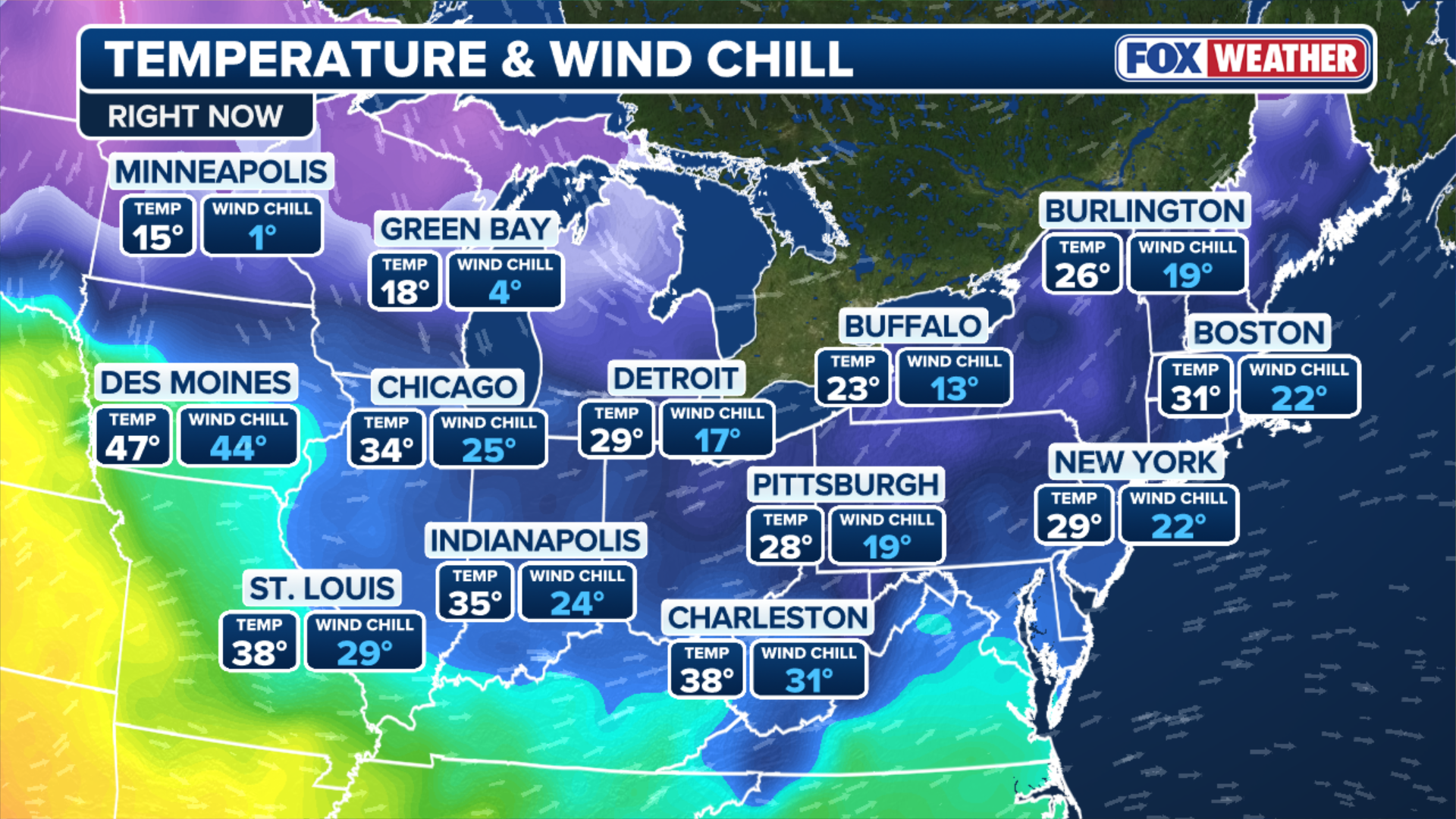Wind chills will be a significant factor as temperatures are expected to drop to 10 to 15 degrees, according to the FOX Forecast Center. Wind chills could reportedly dip near zero in locations such as Bismarck, North Dakota and Buffalo, New York.