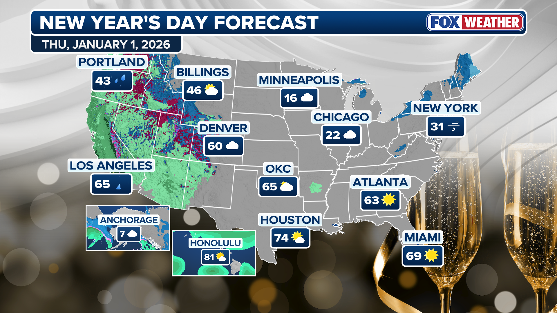 On New Year’s Day, cities such as Los Angeles can expect temperatures of 65 degrees and rain. San Francisco will also see rainfall, with temperatures near 58 degrees. The city is under a Coastal Flood Advisory until Sunday.