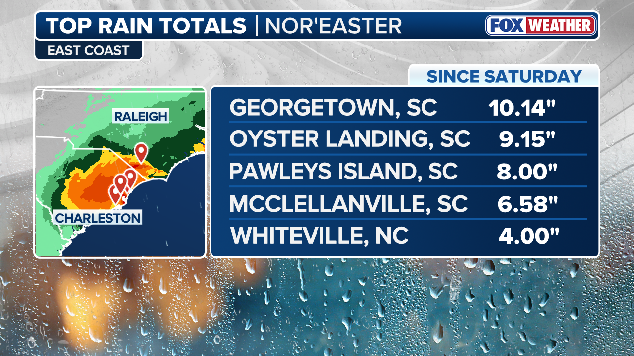 The nor'easter first slammed areas of the Southeast and Carolinas over the weekend, dumping several inches of rain and producing tropical-storm-force wind gusts from an already-battered North Carolina coast up to the Jersey Shore.