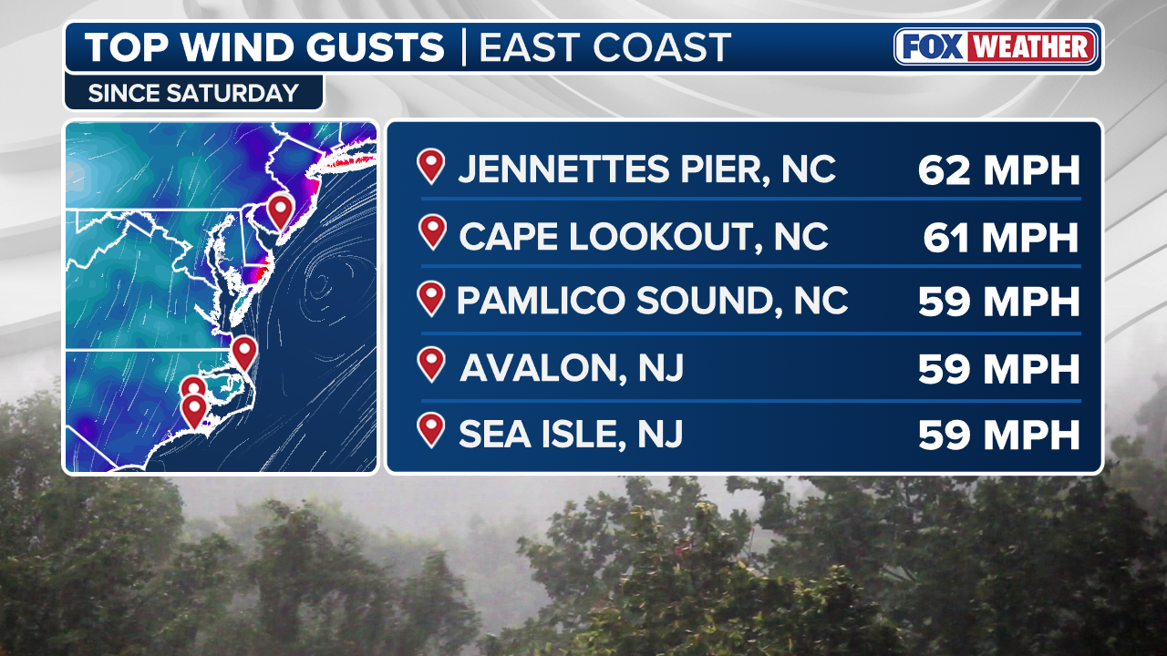 The winds were also whipping, with a 62-mph wind gust reported at Jennettes Pier, North Carolina, and a 61-mph wind gust at Cape Lookout, North Carolina.