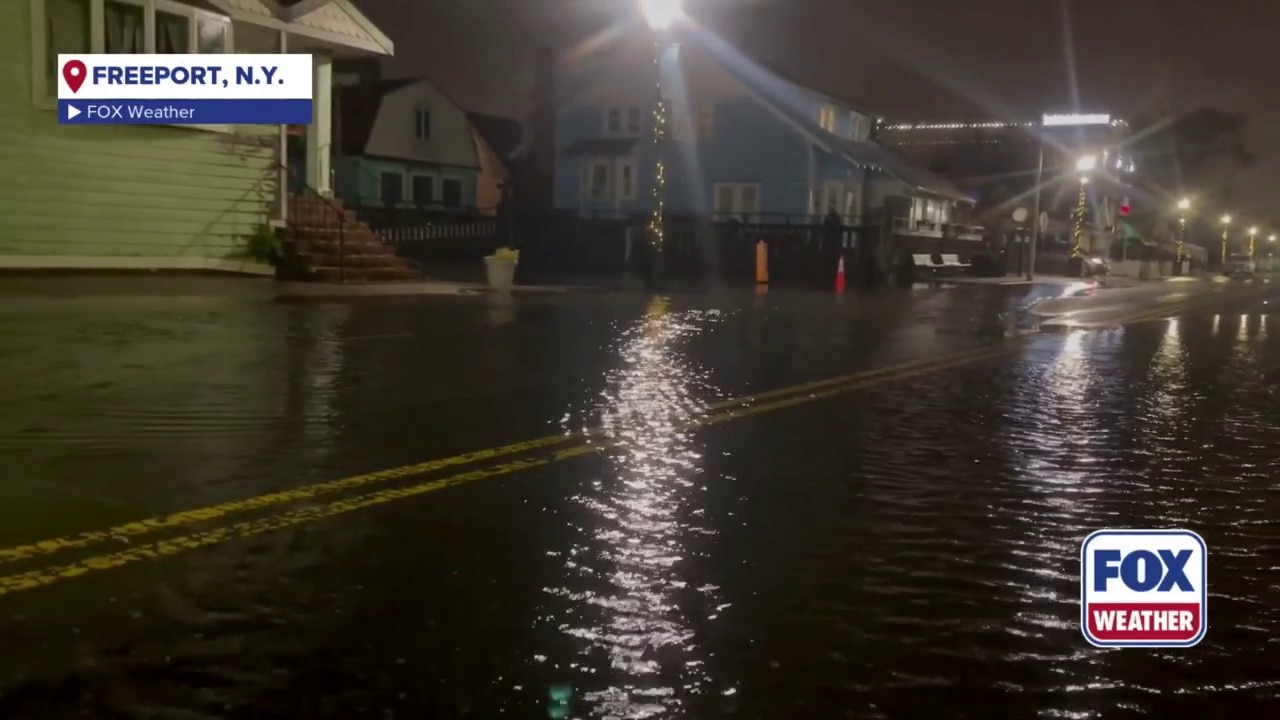 Video recorded in Freeport, New York, on Long Island, showed flooded streets as the nor'easter continued to impact the area on Sunday night and into Monday morning.