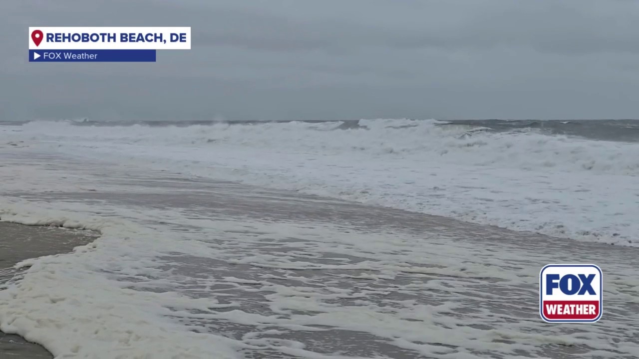 A video shared from Rehoboth Beach, Delaware, shows waves crashing onshore and leading to come beach erosion as a powerful nor'easter blasted the region on Oct. 12, 2025.