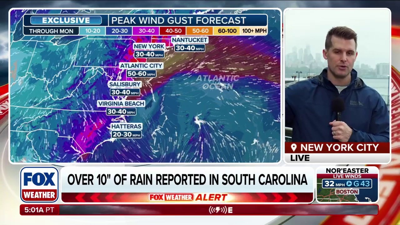 A powerful nor'easter that slammed the East Coast with damaging wind gusts, torrential rain and coastal flooding is continuing to pound areas of the Northeast and New England. FOX Weather Meteorologist Stephen Morgan has the latest from New York City.