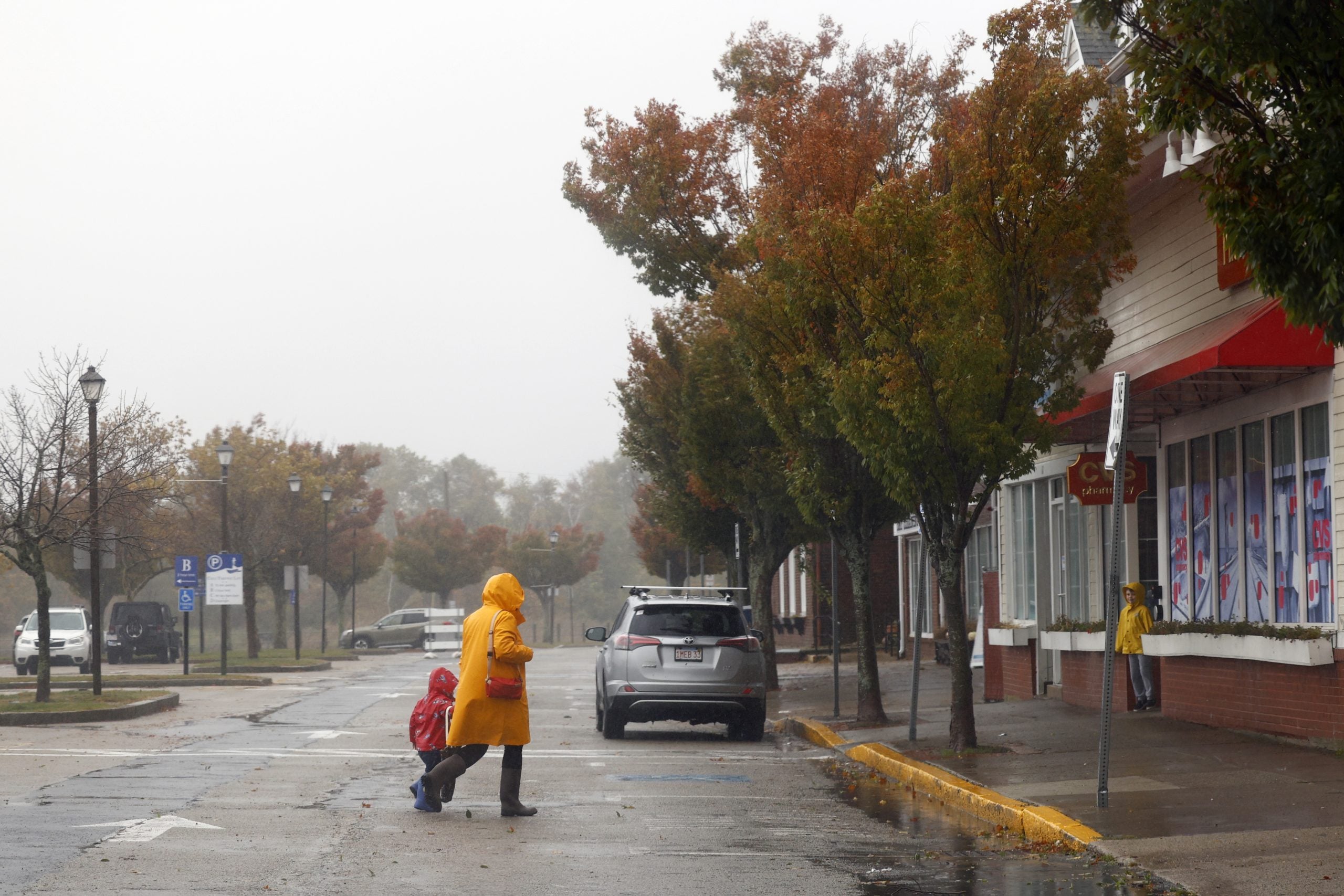 Scituate, MA - October 13: Pedestrians cross Cole Parkway as a nor'easter hits New England on October 13, 2025.