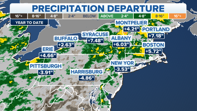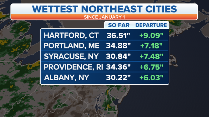 Hartford, Connecticut, has seen a third more rain than normal for this time of year. That's almost 10 inches more. Portland, Maine; Syracuse, New York; and Albany, New York, have gotten 20% more rain than normal so far this year.