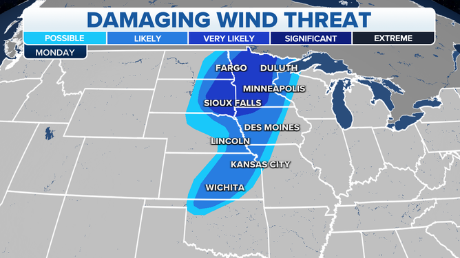 Damaging winds are possible from northern Minnesota south through the Dakotas and Nebraska and stretching into southern Wyoming and northern Colorado.