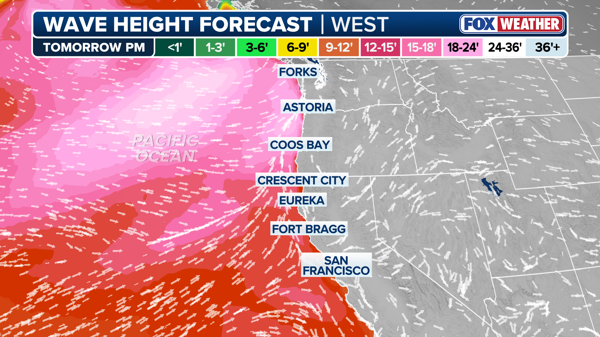 Meanwhile, the storm is also expected to bring 20-foot waves to parts of the coast. The National Weather Service offices in Portland, Oregon, and Eureka, California, have issued a few High Surf Advisories calling for large breaking waves of 21-28 feet in the surf zone that are capable of pulling swimmers quickly out to sea.