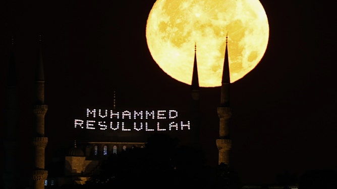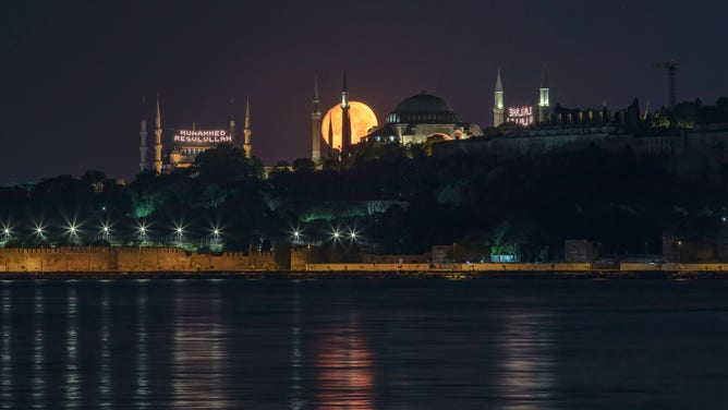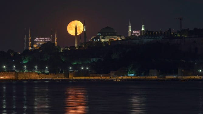 ISTANBUL, TURKIYE - JULY 13: A view of the full moon rises over Blue Mosque and Hagia Sophia Grand Mosque in Istanbul, Turkiye on July 13, 2022. (Photo by Ali Atmaca/Anadolu Agency via Getty Images)