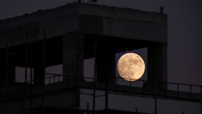 The waxing gibbous moon rises behind a building under construction in Cyprus' capital Nicosia near the United Nations buffer zone on July 12, 2022, a day ahead of the July "buck supermoon". (Photo by Amir MAKAR / AFP) (Photo by AMIR MAKAR/AFP via Getty Images)