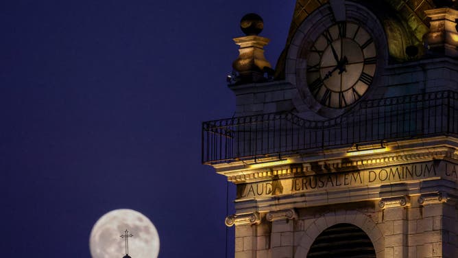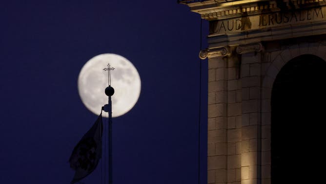 The waxing gibbous moon rises behind a cross at a church in the old city of Jerusalem On July 12, 2022, a day ahead of the July "buck supermoon". (Photo by AHMAD GHARABLI / AFP) (Photo by AHMAD GHARABLI/AFP via Getty Images)