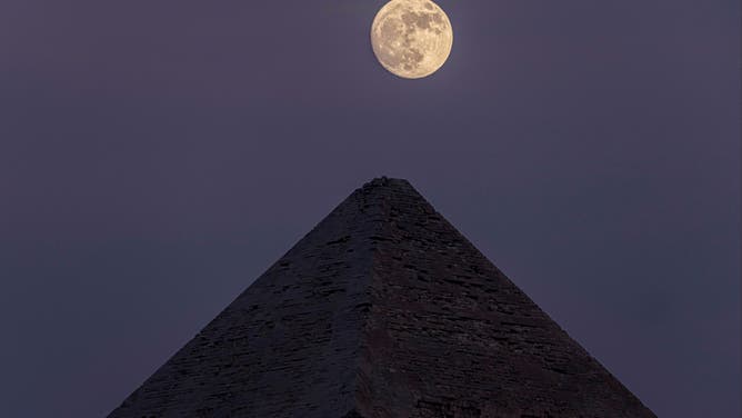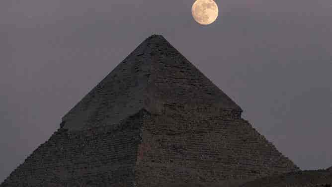The waxing gibbous moon rises over the Pyramid of Khafre (Chephren) at the Giza Pyramids necropolis on the southwestern outskirts of the Egyptian capital on July 12, 2022 a day ahead of the July "buck supermoon". (Photo by Khaled DESOUKI / AFP) (Photo by KHALED DESOUKI/AFP via Getty Images)