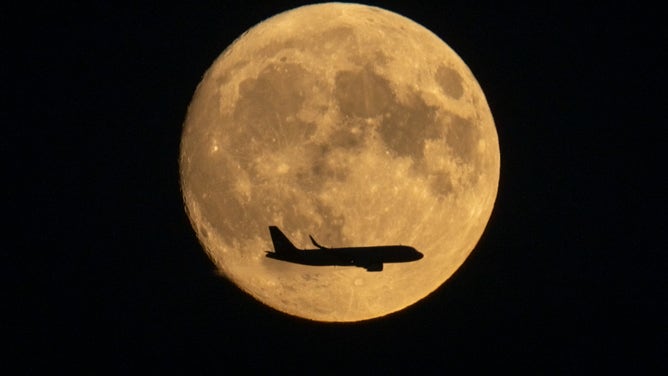 dpatop - 12 July 2022, Hessen, Frankfurt/Main: An airplane on approach to Frankfurt Airport flies past the moon, which can be seen shimmering yellow in the late evening sky. Photo: Frank Rumpenhorst/dpa (Photo by Frank Rumpenhorst/picture alliance via Getty Images)