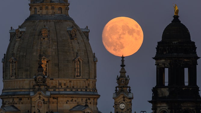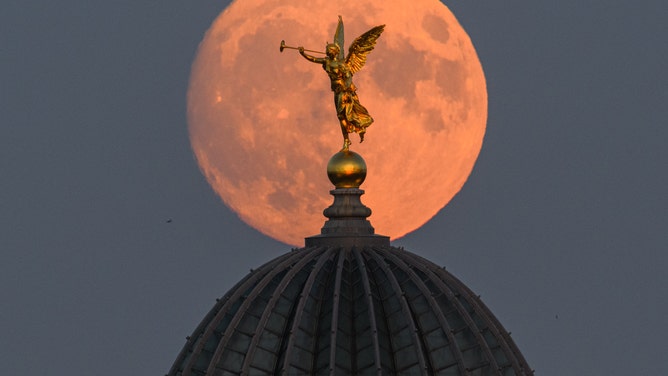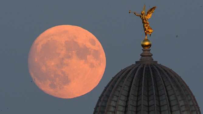 12 July 2022, Saxony, Dresden: The waxing moon rises in the evening behind the dome of the Academy of Arts with the angel "Fama". On July 13, 2022, the moon is full at shortly after 8:30 pm. At the same time the moon is close to the earth, which is why one speaks of supermoon. Photo: Robert Michael/dpa (Photo by Robert Michael/picture alliance via Getty Images)