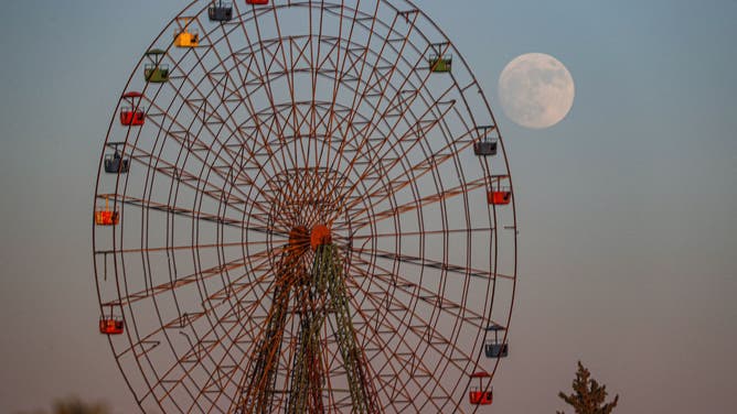 The waxing gibbous moon rises behind a rundown Ferris wheel at an abandoned children's amusement park near al-Nayrab, a village ravaged by pro-government forces bombardment, in Syria's northwestern Idlib province on July 12, 2022 a day ahead of the July "buck supermoon". (Photo by OMAR HAJ KADOUR / AFP) (Photo by OMAR HAJ KADOUR/AFP via Getty Images)