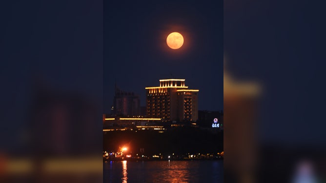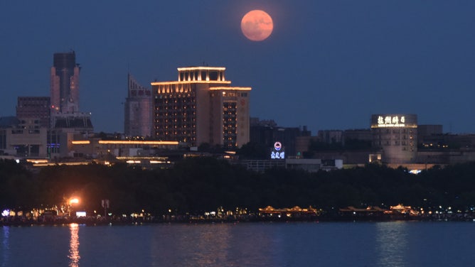 HUAI'AN, CHINA - JULY 13, 2022 - Photo taken on the evening of July 13, 2022 shows the "super moon" in Huai 'an city, East China's Jiangsu Province. The full moon is known to be the biggest super full moon of the year. A supermoon is when the moon is near its perigee at the time of its full moon, making it appear larger than usual because it is closer to earth than usual. (Photo credit should read CFOTO/Future Publishing via Getty Images)