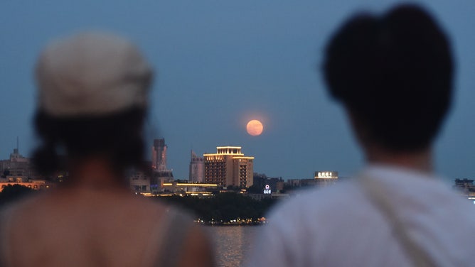 People watch the "super moon" by the West Lake in Hangzhou, East China's Zhejiang Province, July 13, 2022. The full moon is known to be the biggest super full moon of the year. A supermoon is when the moon is near its perigee at the time of its full moon, making it appear larger than usual because it is closer to earth than usual. (Photo credit should read CFOTO/Future Publishing via Getty Images)