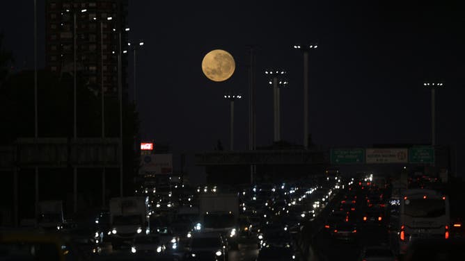 The full moon sets on General Paz Avenue in Buenos Aires, on July 13, 2022. (Photo by JUAN MABROMATA / AFP) (Photo by JUAN MABROMATA/AFP via Getty Images)