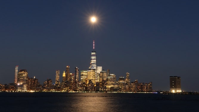 HOBOKEN NJ - JULY 11: A 95 percent illuminated waxing gibbous moon rises over lower Manhattan and One World Trade Centers in New York City on July 11, 2022, as seen from Hoboken, New Jersey. (Photo by Gary Hershorn/Getty Images)