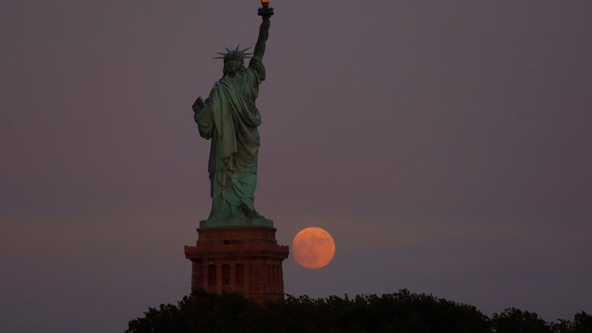 JERSEY CITY, NJ - JULY 12: A 99 percent illuminated Buck Moon rises behind the Statue of Liberty in New York City on July 12, 2022, as seen from Jersey City, New Jersey. (Photo by Gary Hershorn/Getty Images)