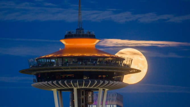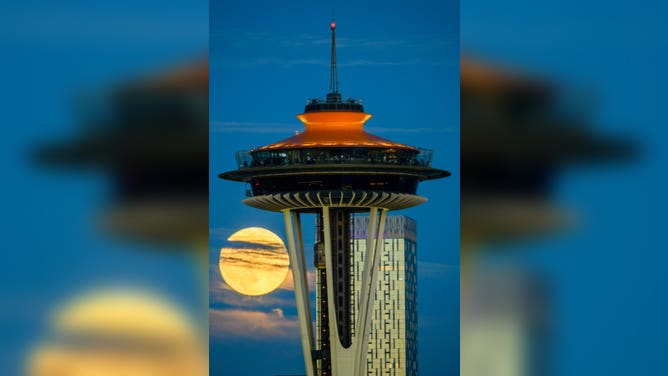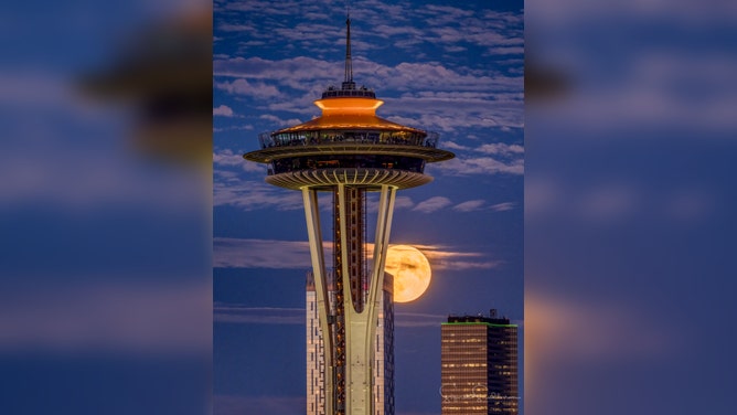 "Watching last night's moon rise above the thinly layered clouds scattered about the otherwise clear skies made for quite the dramatic entrance," Seattle photographer Tim Durkan, who took the photo of the super moon alongside the iconic Space Needle, told FOX Weather. "Even with several hundred people watching from the park, it got so quiet you could hear pin drop. A memorable night."