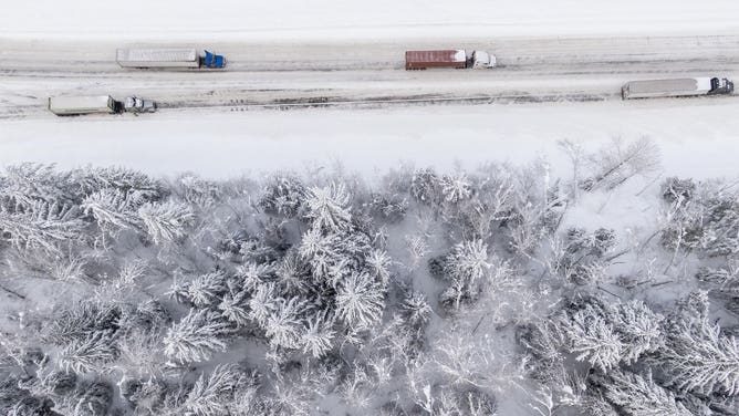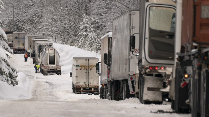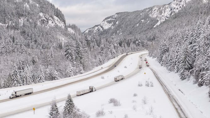 Image 12 of 23Trucks on Interstate 90 after a snow storm near Snoqualmie Pass, Washington, U.S., on Tuesday, Jan. 4, 2022. Snoqualmie Pass had the highest snowfall in 20 years as of Jan. 3, according to the Washington State Department of Transportation (WSDOT). Photographer: David Ryder/Bloomberg via Getty Images ( )
