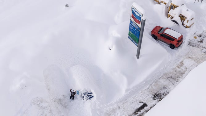 Image 7 of 23A driver digs out a car buried in snow in Snoqualmie Pass, Washington, U.S., on Tuesday, Jan. 4, 2022. Snoqualmie Pass had the highest snowfall in 20 years as of Jan. 3, according to the Washington State Department of Transportation (WSDOT). Photographer: David Ryder/Bloomberg via Getty Images ( )