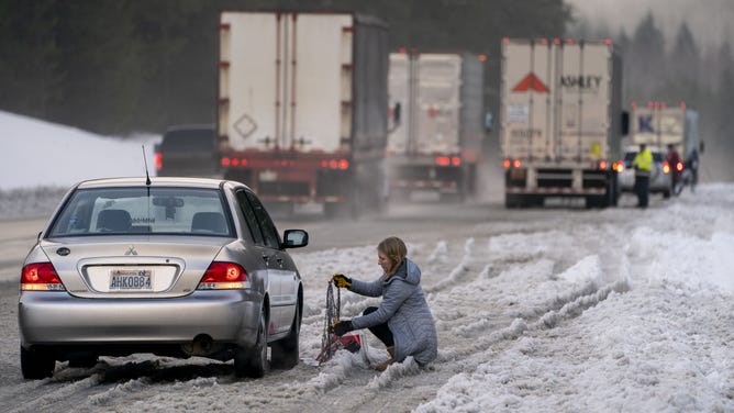 Image 13 of 23A driver installs tire chains along Interstate 90 after a snow storm near Snoqualmie Pass, Washington, U.S., on Tuesday, Jan. 4, 2022. Snoqualmie Pass had the highest snowfall in 20 years as of Jan. 3, according to the Washington State Department of Transportation (WSDOT). Photographer: David Ryder/Bloomberg via Getty Images ( )