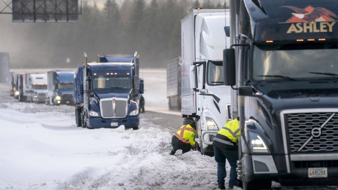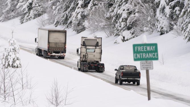 Image 18 of 23Trucks enter Interstate 90 after a snow storm near Snoqualmie Pass, Washington, U.S., on Tuesday, Jan. 4, 2022. Snoqualmie Pass had the highest snowfall in 20 years as of Jan. 3, according to the Washington State Department of Transportation (WSDOT). Photographer: David Ryder/Bloomberg via Getty Images ( )