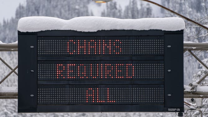 Image 23 of 23A sign alerts travelers on Interstate 90 that tire chains are required after a snow storm near Snoqualmie Pass, Washington, U.S., on Tuesday, Jan. 4, 2022. Snoqualmie Pass had the highest snowfall in 20 years as of Jan. 3, according to the Washington State Department of Transportation (WSDOT). Photographer: David Ryder/Bloomberg via Getty Images ( )
