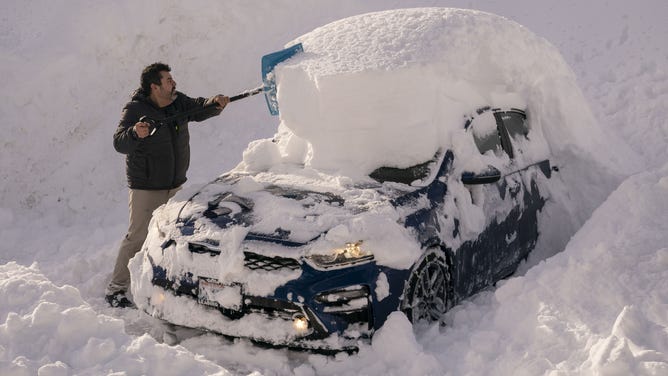 Image 1 of 23A driver clears snow from a car in Snoqualmie Pass, Washington, U.S., on Tuesday, Jan. 4, 2022. Snoqualmie Pass had the highest snowfall in 20 years as of Jan. 3, according to the Washington State Department of Transportation (WSDOT). Photographer: David Ryder/Bloomberg via Getty Images ( )