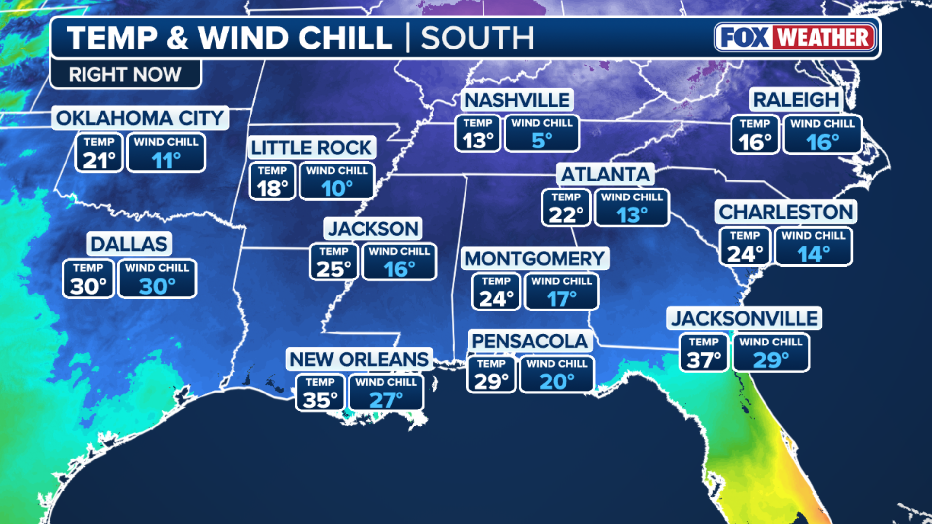 Wind chill temperatures reached single digits in Nashville Monday morning and were in the teens in Jackson, Mississippi.