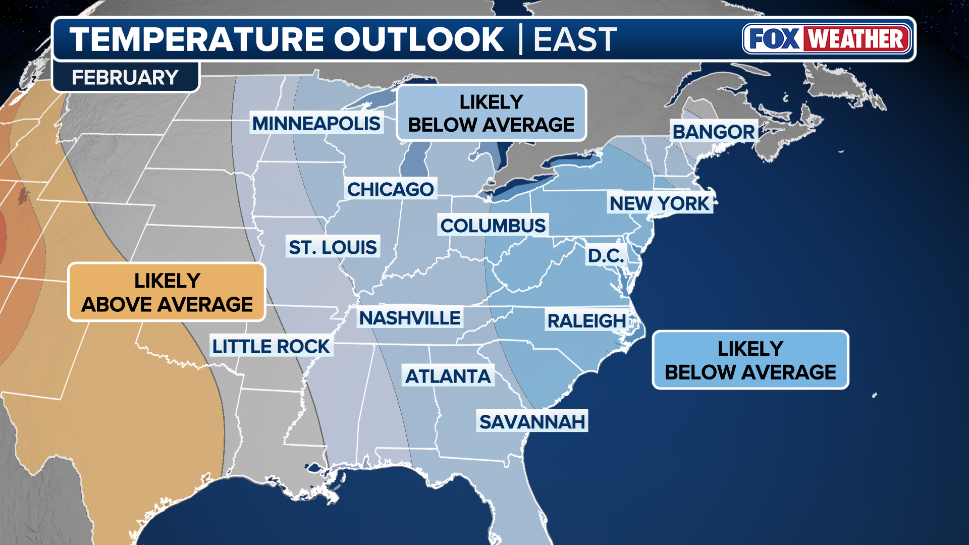 The extreme cold across much of the eastern part of the country is hanging on for February. Areas from the Plains to the Northeast will see below-average temperatures for the month, as a frigid pattern is locked in over the country.