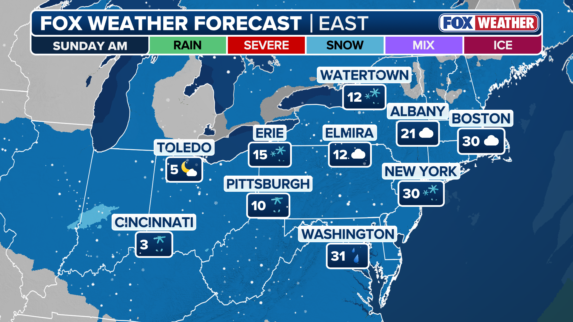 Snow is expected to move into the Northeast overnight Saturday, with people along the Northeast coast waking up to snow Sunday before the system quickly exits the region as early as Sunday afternoon.