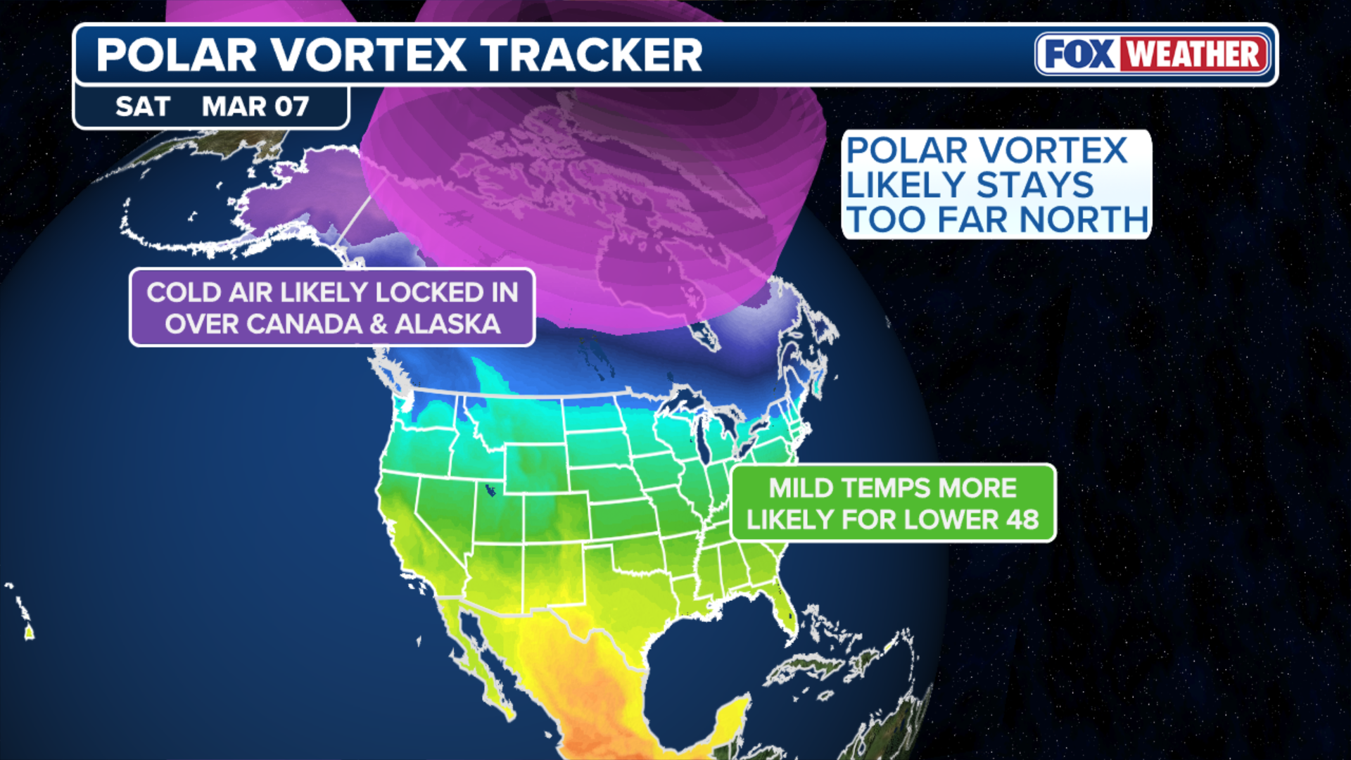 While a weaker polar vortex allows that frigid air to spill lower in the atmosphere and drive freezing surface temperatures, current projections through the first week of March keep the core of the coldest air centered over Canada and Alaska.