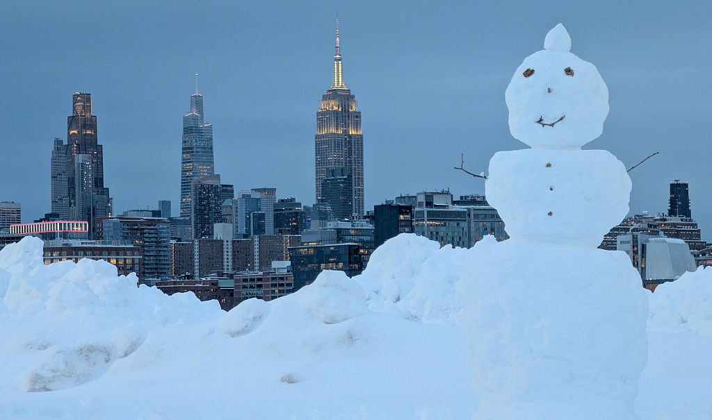 HOBOKEN, NJ - FEBRUARY 23: A snowman stands in a park in front of the skyline of midtown Manhattan and the Empire State Building in New York City following a snowstorm on February 23, 2026, in Hoboken, New Jersey.
