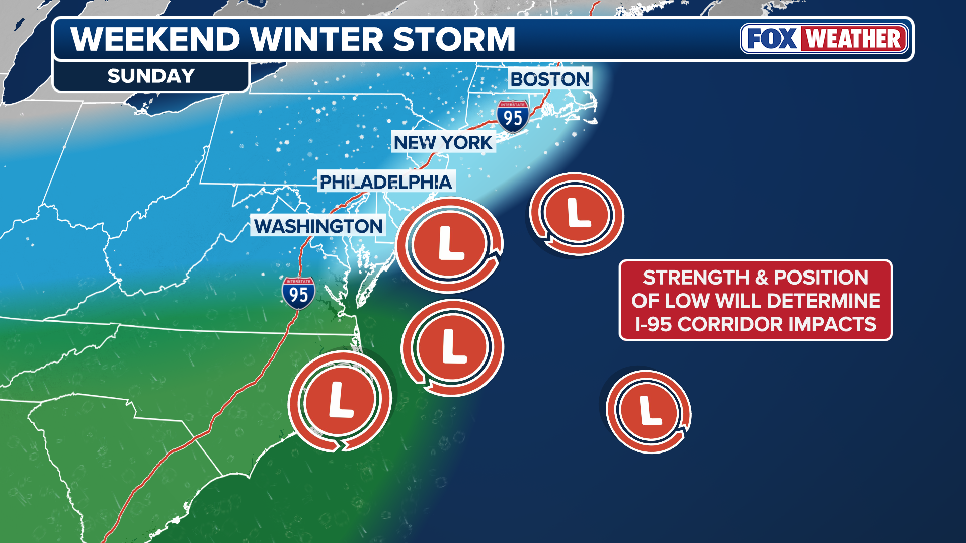 The FOX Forecast Center is tracking the potential for a significant snowstorm and potential Nor'easter to impact the I-95 corridor Sunday into Monday. The third in a series of three winter storms set to impact the Eastern U.S. this week, the Sunday-Monday system has the highest ceiling for significant impacts. The storm originates from a disturbance currently moving along the coast of British Columbia in Canada. As it reaches the East Coast, it is expected to develop a surface low-pressure system that will track offshore, potentially bringing major snow to the Northeast. However, the forecast is far from set in stone. Everything needs to line up perfectly for a "blockbuster" storm.