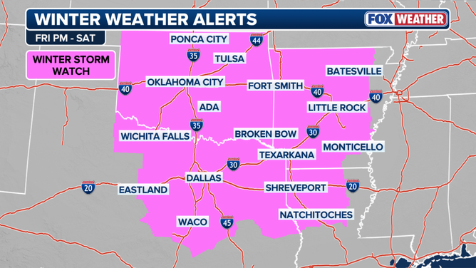 The first wave of Winter Weather Alerts has been issued for portions of Texas, Oklahoma and Arkansas from Friday night through Saturday. Heavy accumulations of snow and ice are possible, and Winter Weather Watches are in effect.