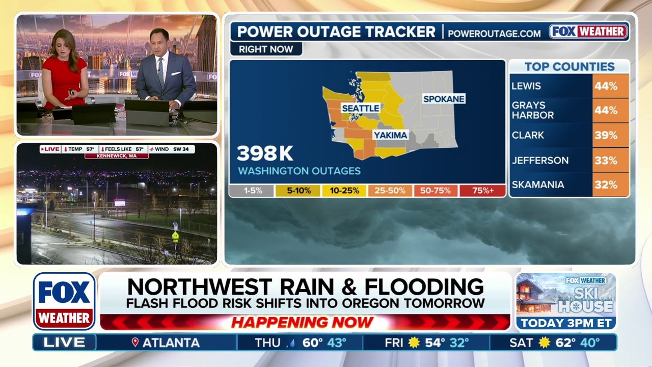 Powerful wind gusts knocked out power to more than 500,000 customers across Washington and Oregon early Wednesday, as the latest atmospheric river intensified over the flood-devastated region. The Skagit River forecast indicates it will rise back into major flood stage early Wednesday. While record levels are not expected, major flooding would still result in significant impacts in this already hard-hit area. Thursday, the highest risk for flash flooding looks to shift more southward, over coastal regions of Oregon and then Northern California by Friday.