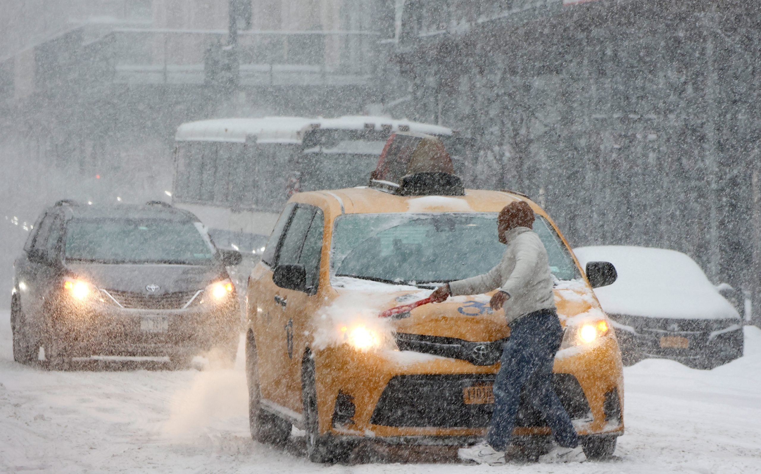 NEW YORK, NY - JANUARY 25: A taxi driver clears snow off his cab while stopped at a traffic light on Fifth Avenue during a snowstorm on January 25, 2026, in New York City.