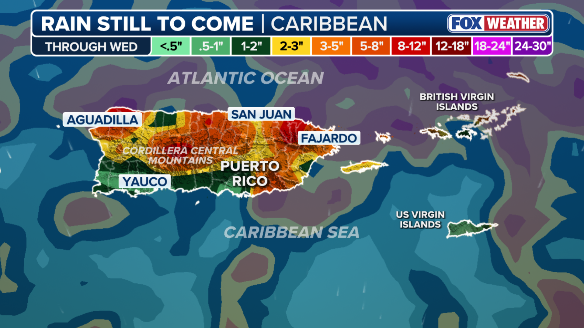According to the FOX Forecast Center, landslides are possible due to significant runoff from flooding. At least 3 to 5 inches of rain is expected across higher elevations in Puerto Rico, but areas could see as much as 12 inches.