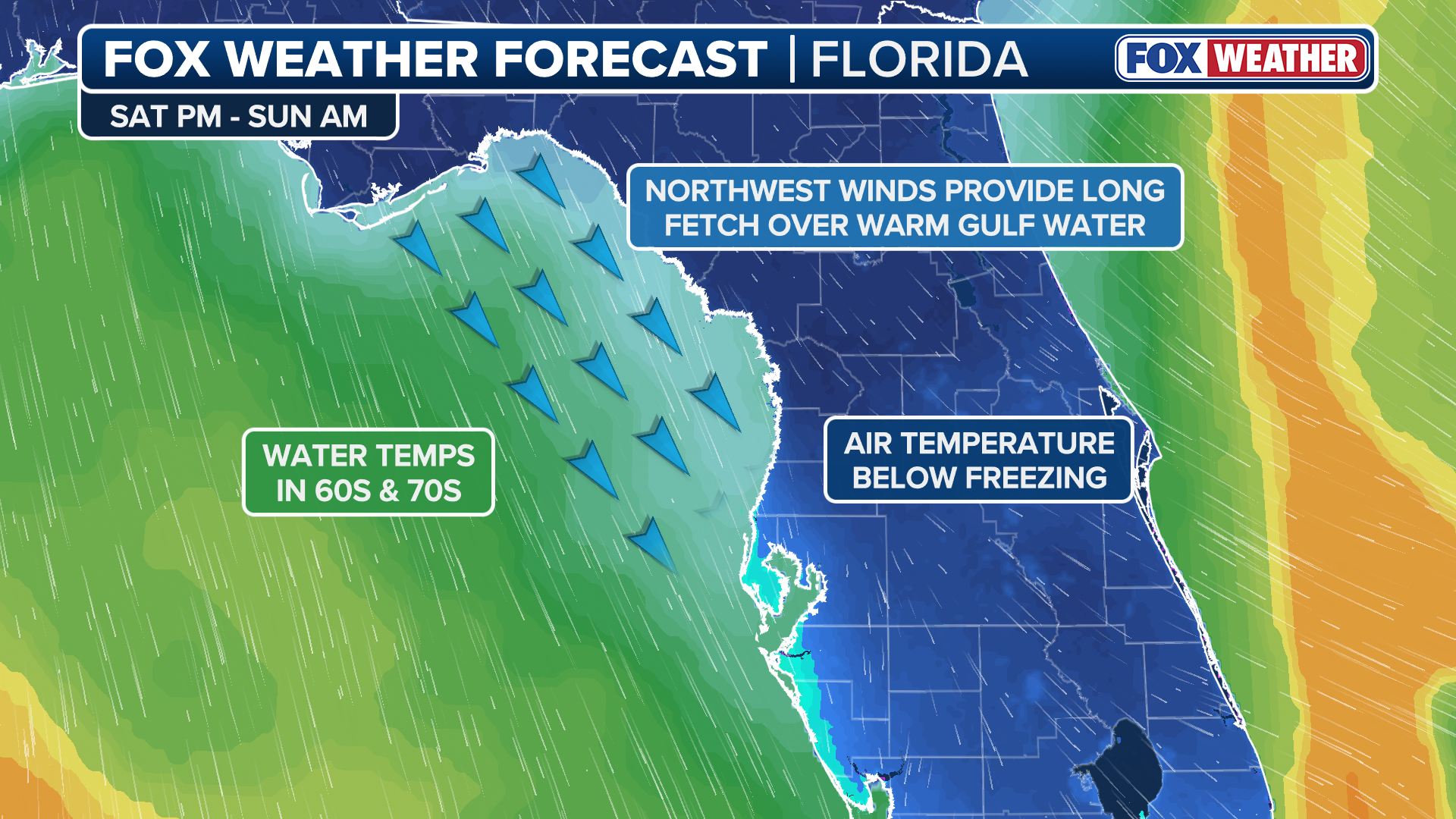In Florida, a "Gulf-effect" setup could happen if cold air moves over the relatively warmer Gulf waters. But for this to happen, there needs to be a long fetch of northwest winds picking up moisture, combined with a big enough difference between the water temperature and the cold air above.