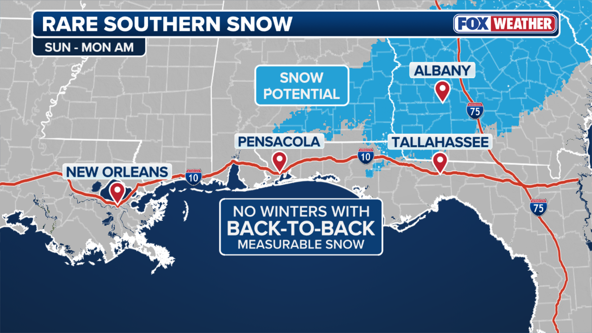 If measurable snow does make it into the Florida Panhandle, even a small amount would make history, as Pensacola and Tallahassee have never gone two consecutive winters with measurable snow.